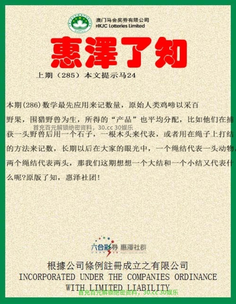 286期:数学最先应用来记数量,原始人类鸡啼以采百野果,围猎野兽为生,解明肖鸡,野肖鼠虎兔龙蛇猴。所得的“产品”也平均分配,比如他们在推获一头野兽后用一个石子,一根木头来代表,或者用在绳子上打结的方法来记数,长期以后在大家的眼光中,一个绳结代表一头动物两个绳结代表两头,那我们这期想想一个大结和一个小结又代表什么呢?